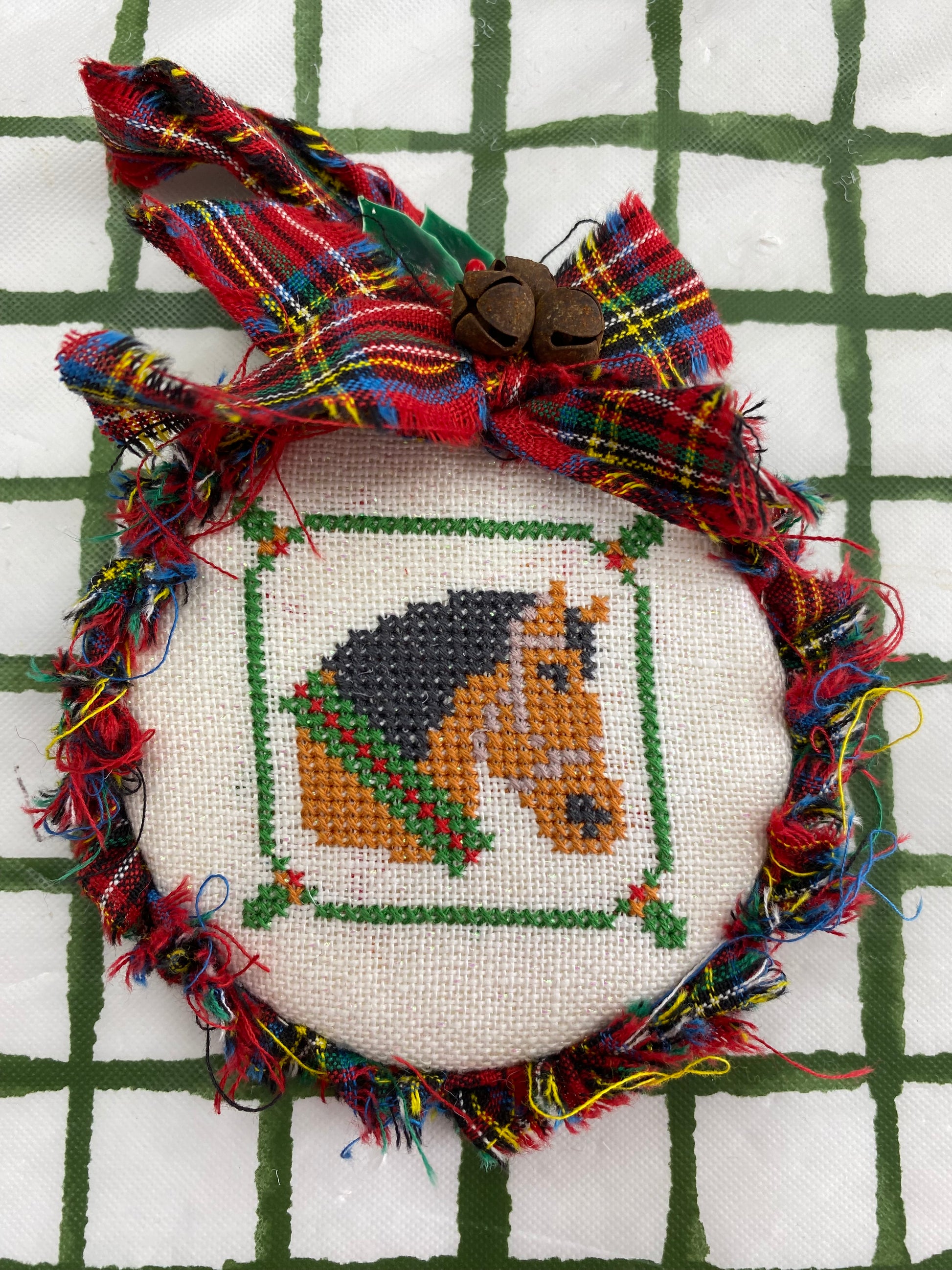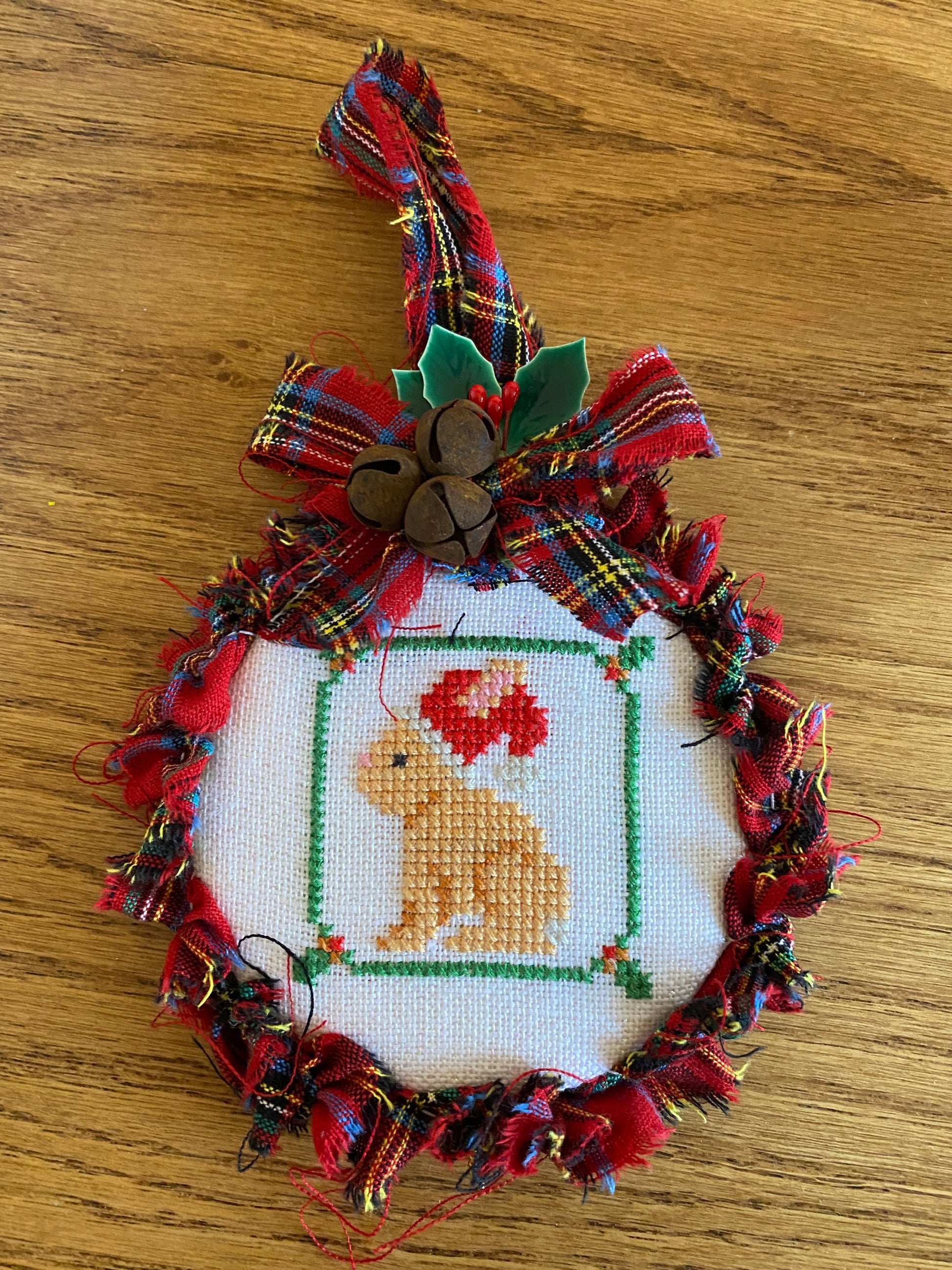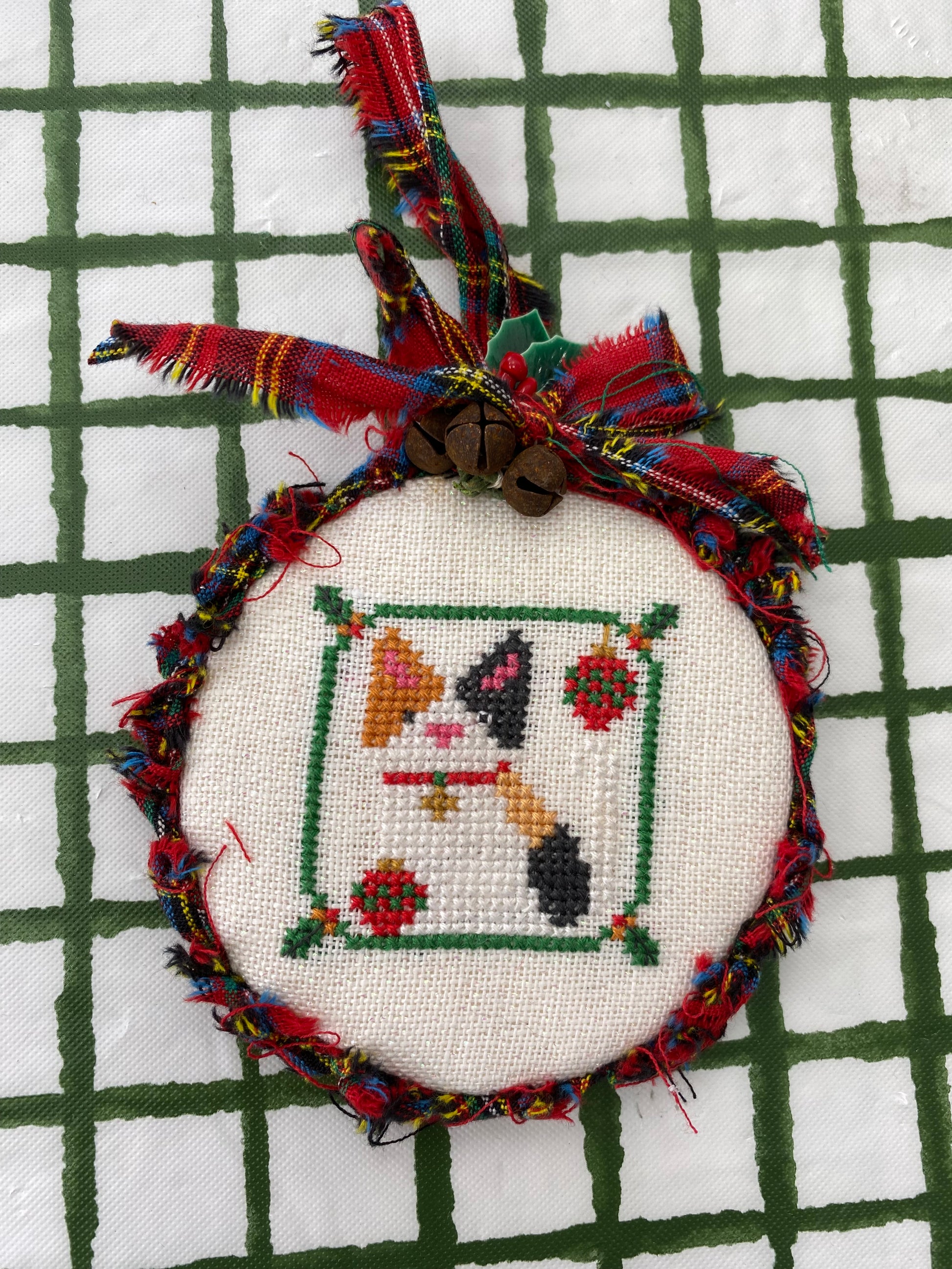 Complete kit to complete an ornament. Includes pattern, fabric, floss needle and other items to complete your ornament. Just about everything will be there-- you will need to have glue, scissors, sewing thread .