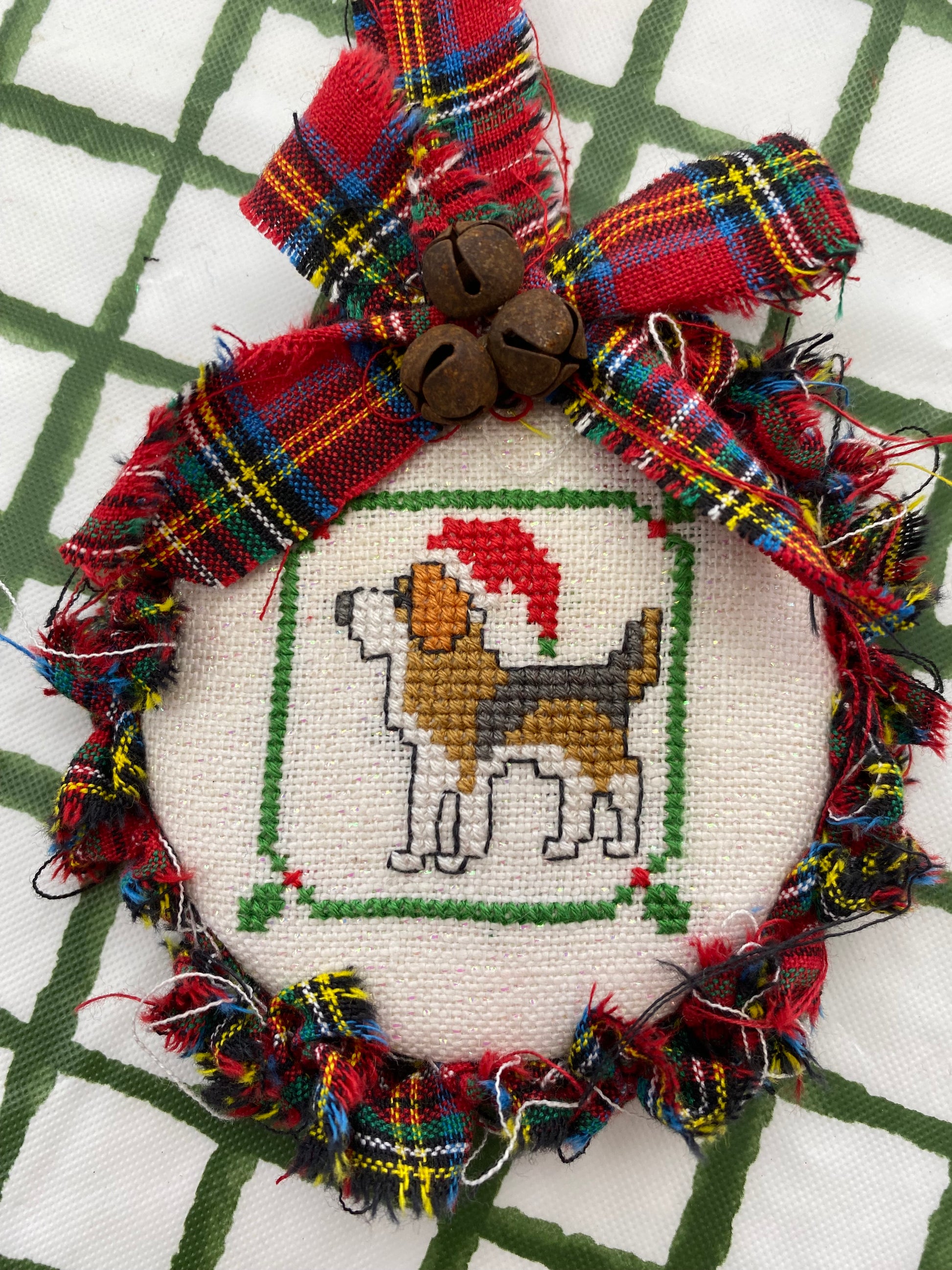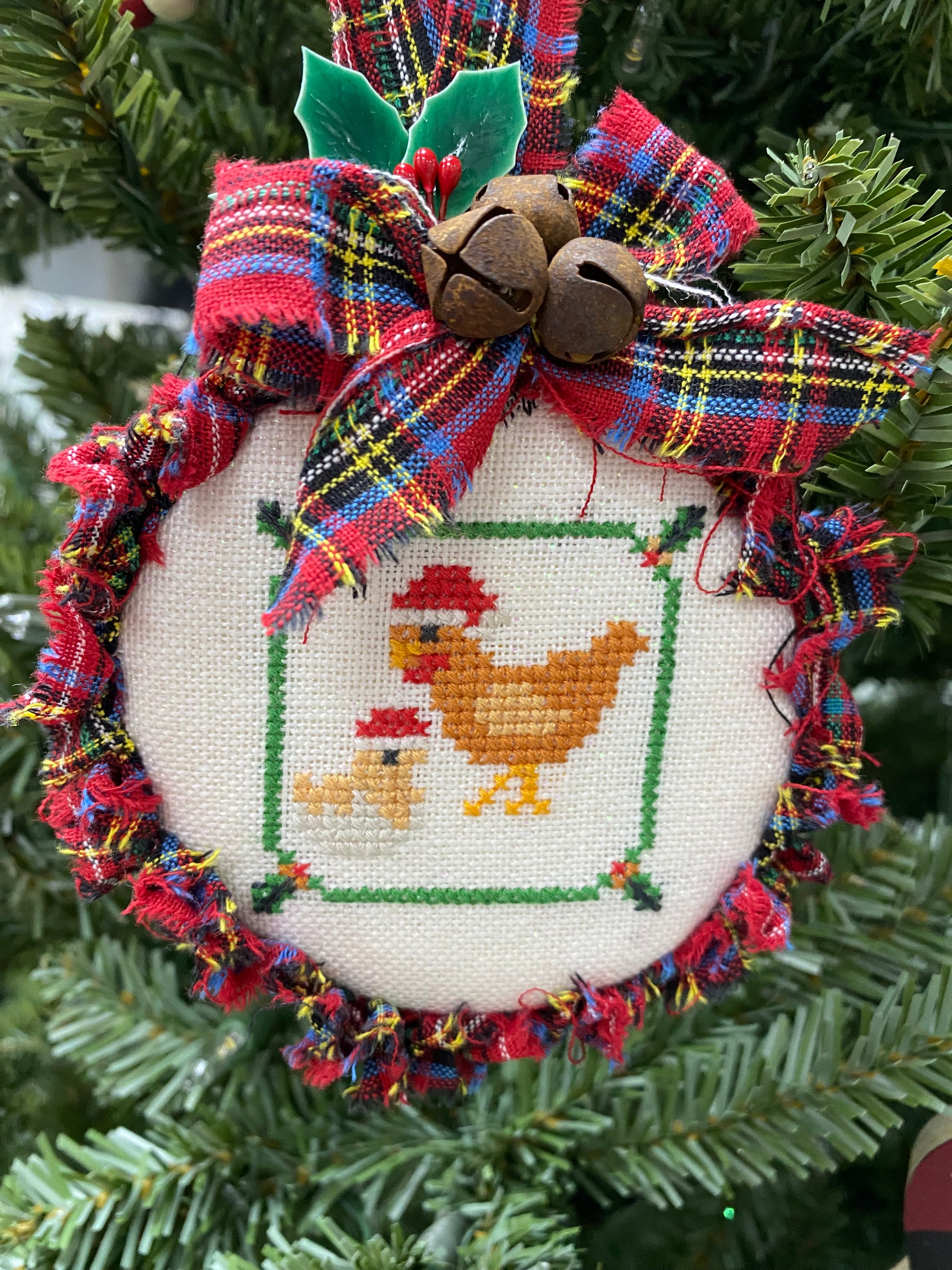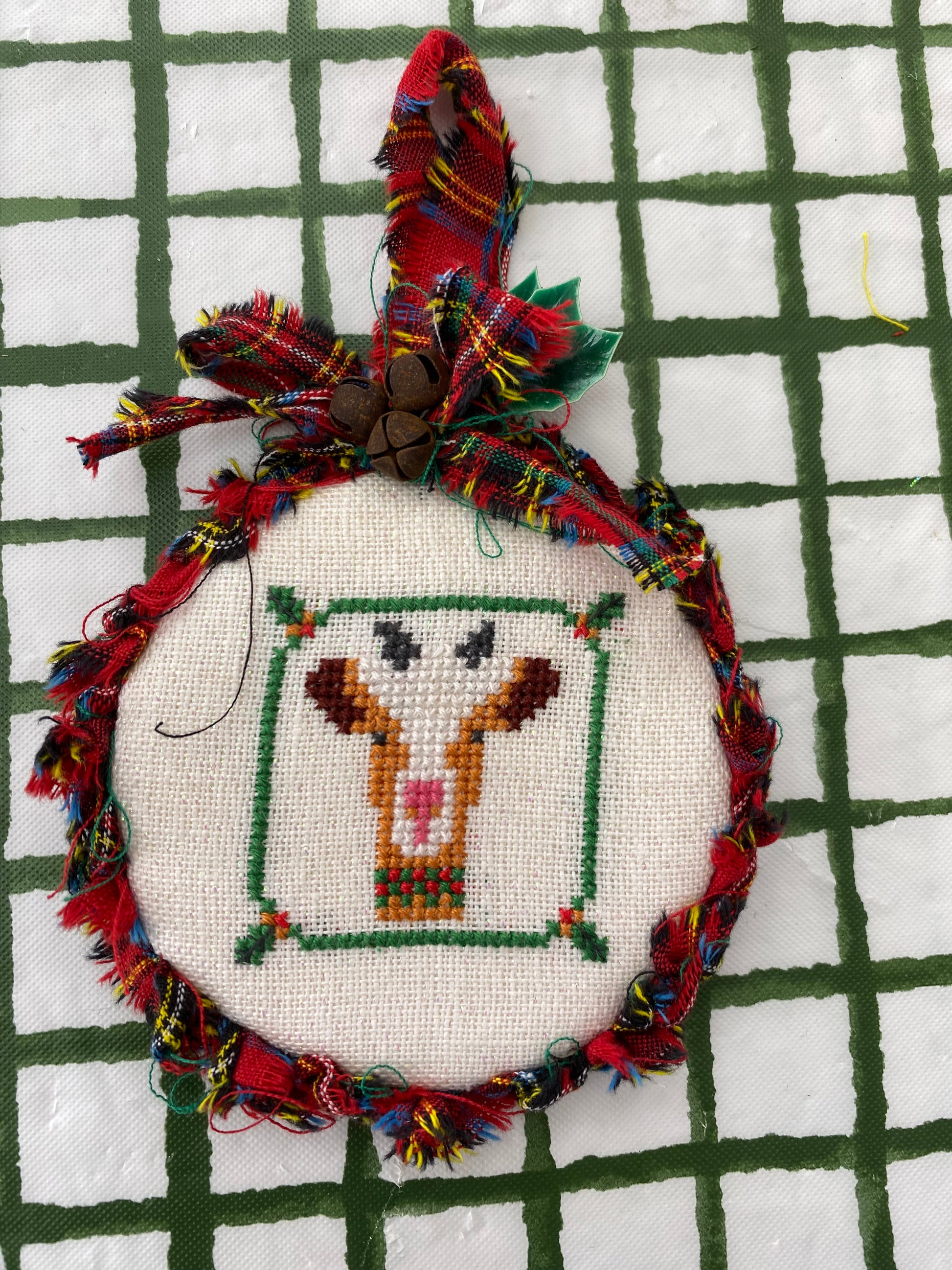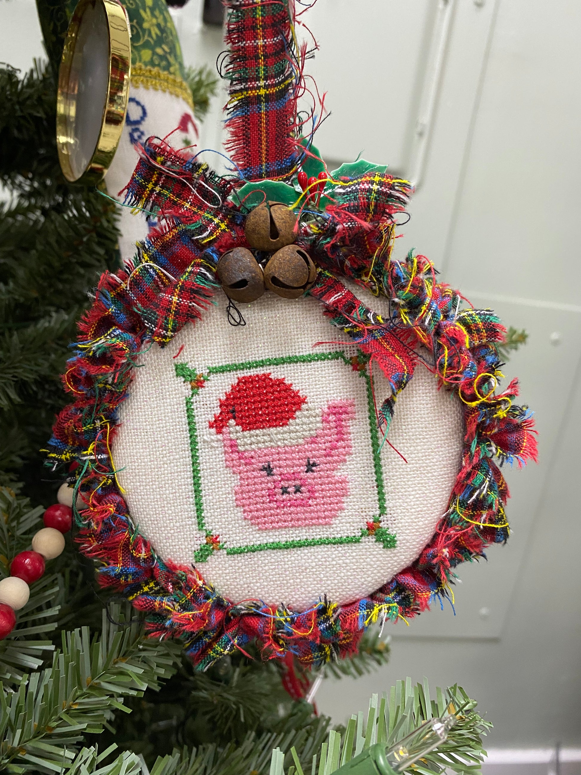 Complete kit to complete an ornament. Includes pattern, fabric, floss needle and other items to complete your ornament. Just about everything will be there-- you will need to have glue, scissors, sewing thread .