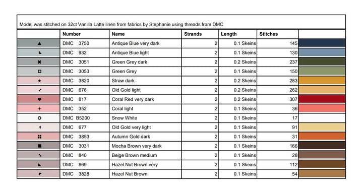 The models were stitched 2 over 2 on 32 count cream-colored evenweave using DMC threads. As always, feel free to customize fabric and floss colors to suit your style or décor.