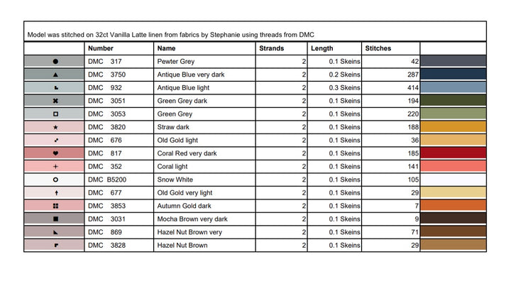 The models were stitched 2 over 2 on 32 count cream-colored evenweave using DMC threads. As always, feel free to customize fabric and floss colors to suit your style or décor.